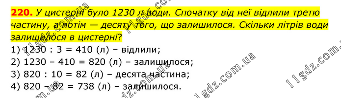У цистерні було 1230 л води. Спочатку від неї відлили третю частину, а потім — десяту того, що залишилося. Скільки літрів води залишилося в цистерні? 1) 1230 : 3 = 410 (л) – відлили; 2) 1230 – 410 = 820 (л) – залишилося; 3) 820 : 10 = 82 (л) – десята частина; 4) 820 – 82 = 738 (л) – залишилося.