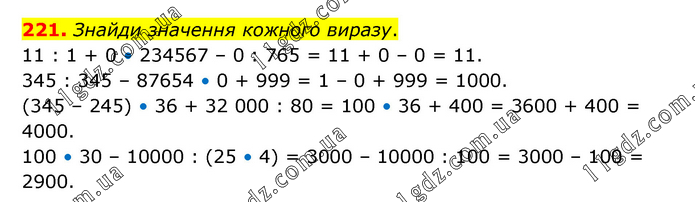 Знайди значення кожного виразу. 11 : 1 + 0 • 234567 – 0 : 765 = 11 + 0 – 0 = 11. 345 : 345 – 87654 • 0 + 999 = 1 – 0 + 999 = 1000. (345 – 245) • 36 + 32 000 : 80 = 100 • 36 + 400 = 3600 + 400 = 4000. 100 • 30 – 10000 : (25 • 4) = 3000 – 10000 : 100 = 3000 – 100 = 2900.