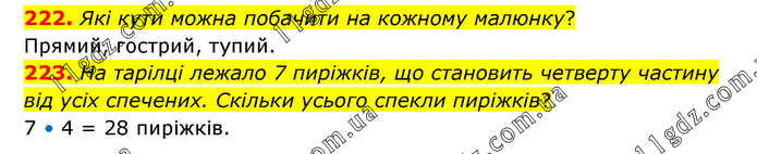 222. Які кути можна побачити на кожному малюнку? Прямий, гострий, тупий. 223. На тарілці лежало 7 пиріжків, що становить четверту частину від усіх спечених. Скільки усього спекли пиріжків? 7 • 4 = 28 пиріжків.