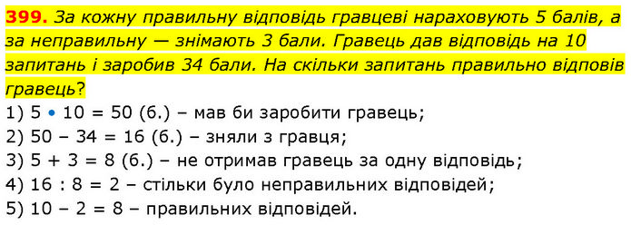 За кожну правильну відповідь гравцеві нараховують 5 балів, а за неправильну — знімають 3 бали. Гравець дав відповідь на 10 запитань і заробив 34 бали. На скільки запитань правильно відповів гравець? 1) 5 • 10 = 50 (б.) – мав би заробити гравець; 2) 50 – 34 = 16 (б.) – зняли з гравця; 3) 5 + 3 = 8 (б.) – не отримав гравець за одну відповідь; 4) 16 : 8 = 2 – стільки було неправильних відповідей; 5) 10 – 2 = 8 – правильних відповідей.