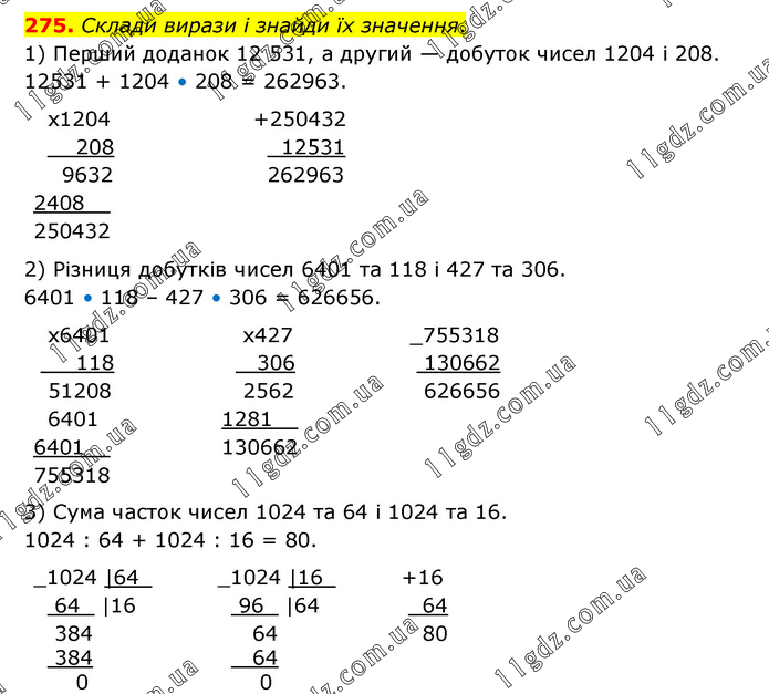 Склади вирази і знайди їх значення. 1) Перший доданок 12 531, а другий — добуток чисел 1204 і 208. 12531 + 1204 • 208 = 262963. 2) Різниця добутків чисел 6401 та 118 і 427 та 306. 6401 • 118 – 427 • 306 = 626656. 3) Сума часток чисел 1024 та 64 і 1024 та 16. 1024 : 64 + 1024 : 16 = 80.