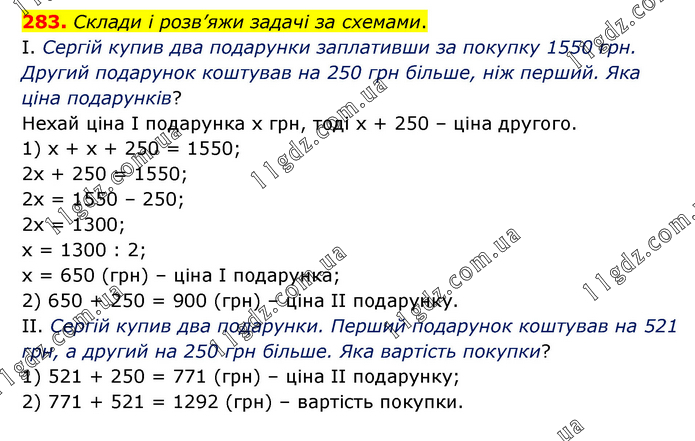 Склади і розв’яжи задачі за схемами. І. Сергій купив два подарунки заплативши за покупку 1550 грн. Другий подарунок коштував на 250 грн більше, ніж перший. Яка ціна подарунків? Нехай ціна І подарунка х грн, тоді х + 250 – ціна другого. 1) х + х + 250 = 1550; 2х + 250 = 1550; 2х = 1550 – 250; 2х = 1300; х = 1300 : 2; х = 650 (грн) – ціна І подарунка; 2) 650 + 250 = 900 (грн) – ціна ІІ подарунку. ІІ. Сергій купив два подарунки. Перший подарунок коштував на 521 грн, а другий на 250 грн більше. Яка вартість покупки? 1) 521 + 250 = 771 (грн) – ціна ІІ подарунку; 2) 771 + 521 = 1292 (грн) – вартість покупки.