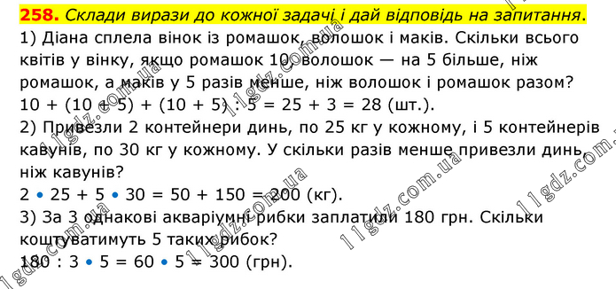 Склади вирази до кожної задачі і дай відповідь на запитання. 1) Діана сплела вінок із ромашок, волошок і маків. Скільки всього квітів у вінку, якщо ромашок 10, волошок — на 5 більше, ніж ромашок, а маків у 5 разів менше, ніж волошок і ромашок разом? 10 + (10 + 5) + (10 + 5) : 5 = 25 + 3 = 28 (шт.). 2) Привезли 2 контейнери динь, по 25 кг у кожному, і 5 контейнерів кавунів, по 30 кг у кожному. У скільки разів менше привезли динь, ніж кавунів? 2 • 25 + 5 • 30 = 50 + 150 = 200 (кг). 3) За 3 однакові акваріумні рибки заплатили 180 грн. Скільки коштуватимуть 5 таких рибок? 180 : 3 • 5 = 60 • 5 = 300 (грн).