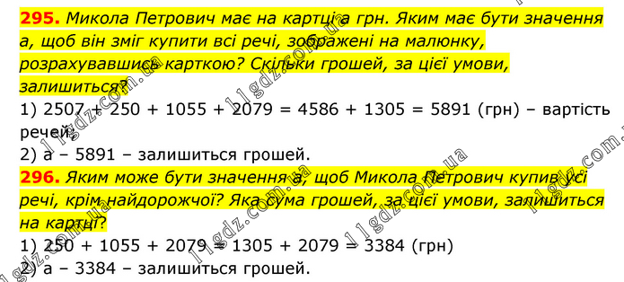 295. Микола Петрович має на картці а грн. Яким має бути значення а, щоб він зміг купити всі речі, зображені на малюнку, розрахувавшись карткою? Скільки грошей, за цієї умови, залишиться? 1) 2507 + 250 + 1055 + 2079 = 4586 + 1305 = 5891 (грн) – вартість речей; 2) а – 5891 – залишиться грошей. 296. Яким може бути значення а, щоб Микола Петрович купив усі речі, крім найдорожчої? Яка сума грошей, за цієї умови, залишиться на картці? 1) 250 + 1055 + 2079 = 1305 + 2079 = 3384 (грн) 2) а – 3384 – залишиться грошей.