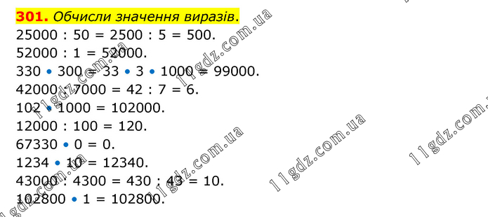 Обчисли значення виразів. 25000 : 50 = 2500 : 5 = 500. 52000 : 1 = 52000. 330 • 300 = 33 • 3 • 1000 = 99000. 42000 : 7000 = 42 : 7 = 6. 102 • 1000 = 102000. 12000 : 100 = 120. 67330 • 0 = 0. 1234 • 10 = 12340. 43000 : 4300 = 430 : 43 = 10. 102800 • 1 = 102800.