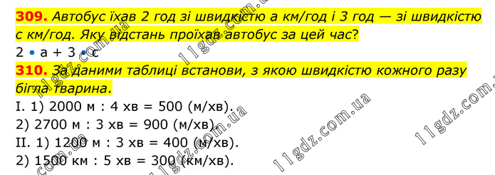 309. Автобус їхав 2 год зі швидкістю а км/год і 3 год — зі швидкістю с км/год. Яку відстань проїхав автобус за цей час? 2 • а + 3 • с 310. За даними таблиці встанови, з якою швидкістю кожного разу бігла тварина. І. 1) 2000 м : 4 хв = 500 (м/хв). 2) 2700 м : 3 хв = 900 (м/хв). ІІ. 1) 1200 м : 3 хв = 400 (м/хв). 2) 1500 км : 5 хв = 300 (км/хв).