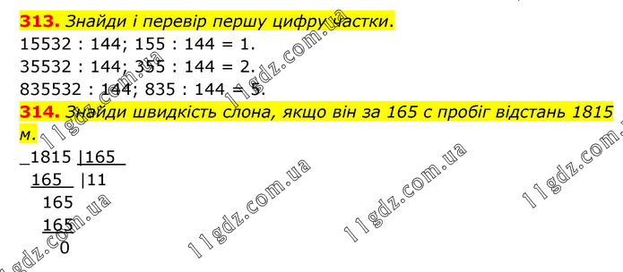 313. Знайди і перевір першу цифру частки. 15532 : 144; 155 : 144 = 1. 35532 : 144; 355 : 144 = 2. 835532 : 144; 835 : 144 = 5. 314. Знайди швидкість слона, якщо він за 165 с пробіг відстань 1815 м.