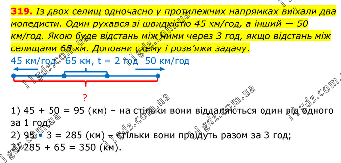 Із двох селищ одночасно у протилежних напрямках виїхали два мопедисти. Один рухався зі швидкістю 45 км/год, а інший — 50 км/год. Якою буде відстань між ними через 3 год, якщо відстань між селищами 65 км. Доповни схему і розв’яжи задачу. 1) 45 + 50 = 95 (км) – на стільки вони віддаляються один від одного за 1 год; 2) 95 • 3 = 285 (км) – стільки вони проїдуть разом за 3 год; 3) 285 + 65 = 350 (км).