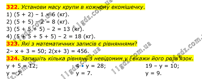322. Установи масу крупи в кожному екомішечку. 1) (5 + 2) – 1 = 6 (кг). 2) (5 + 5) – 2 = 8 (кг). 3) (5 + 5 + 5) – 2 = 13 (кг). 4) (5 + 5 + 5 + 5) – 2 = 18 (кг). 323. Які з математичних записів є рівняннями? 2– х + 3 = 50; 2(х+ 3) = 456. 324. Запишіть кілька рівнянь з невідомим у і вкажи його розв’язок. у + 5 = 12; у = 7. 4 • у = 28; у = 7. 19 – у = 10; у = 9.