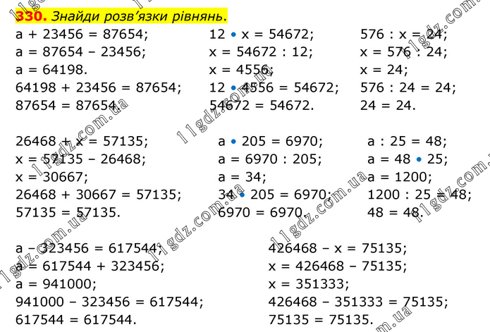 Знайди розв’язки рівнянь. а + 23456 = 87654; а = 87654 – 23456; а = 64198. 64198 + 23456 = 87654; 87654 = 87654. 12 • х = 54672; х = 54672 : 12; х = 4556; 12 • 4556 = 54672; 54672 = 54672. 576 : х = 24; х = 576 : 24; х = 24; 576 : 24 = 24; 24 = 24. 26468 + х = 57135; х = 57135 – 26468; х = 30667; 26468 + 30667 = 57135; 57135 = 57135. а • 205 = 6970; а = 6970 : 205; а = 34; 34 • 205 = 6970; 6970 = 6970. а : 25 = 48; а = 48 • 25; а = 1200; 1200 : 25 = 48; 48 = 48. а – 323456 = 617544; а = 617544 + 323456; а = 941000; 941000 – 323456 = 617544; 617544 = 617544. 426468 – х = 75135; х = 426468 – 75135; х = 351333; 426468 – 351333 = 75135; 75135 = 75135.