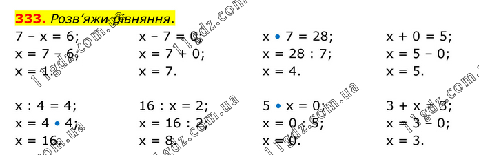 333. Розв’яжи рівняння. 7 – х = 6; х = 7 – 6; х = 1. х – 7 = 0; х = 7 + 0; х = 7. х • 7 = 28; х = 28 : 7; х = 4. х + 0 = 5; х = 5 – 0; х = 5. х : 4 = 4; х = 4 • 4; х = 16. 16 : х = 2; х = 16 : 2; х = 8. 5 • х = 0; х = 0 : 5; х = 0. 3 + х = 3; х = 3 – 0; х = 3.