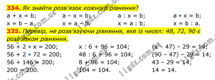 334. Як знайти розв’язок кожного рівняння? a + х = b; x = b – a. a – х = b; x = a – b. a : x = b; x = a : b; a • х = b; x = b : a. 335. Перевір, не розв’язуючи рівняння, яке із чисел: 48, 72, 90 є розв’язком рівняння. 56 + 2 • х = 200; 56 + 2 • 72 = 200; 56 + 146 = 200; 200 = 200. х : 6 + 96 = 104; 48 : 6 + 96 = 104; 8 + 96 = 104; 104 = 104. (х – 47) – 29 = 14; (90 – 47) – 29 = 14; 43 – 29 = 14; 14 = 14.
