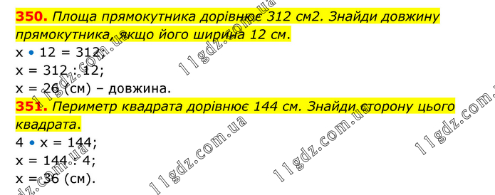 350. Площа прямокутника дорівнює 312 см2. Знайди довжину прямокутника, якщо його ширина 12 см. х • 12 = 312; х = 312 : 12; х = 26 (см) – довжина. 351. Периметр квадрата дорівнює 144 см. Знайди сторону цього квадрата. 4 • х = 144; х = 144 : 4; х = 36 (см).