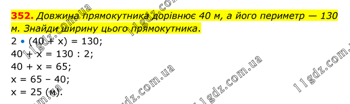 Довжина прямокутника дорівнює 40 м, а його периметр — 130 м. Знайди ширину цього прямокутника. 2 • (40 + х) = 130; 40 + х = 130 : 2; 40 + х = 65; х = 65 – 40; х = 25 (м).