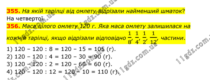 355. На якій тарілці від омлету відрізали найменший шматок? На четвертої. 356. Маса цілого омлету 120 г. Яка маса омлету залишилася на кожній тарілці, якщо відрізали відповідно 1/8, 1/4, 1/2, 1/12, частини. 1) 120 – 120 : 8 = 120 – 15 = 105 (г). 2) 120 – 120 : 4 = 120 – 30 = 90 (г). 3) 120 – 120 : 2 = 120 – 60 = 60 (г). 4) 120 – 120 : 12 = 120 – 10 = 110 (г).