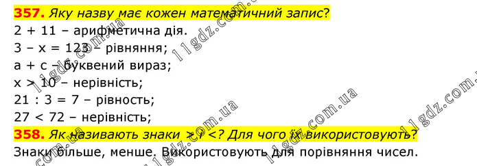 357. Яку назву має кожен математичний запис? 2 + 11 – арифметична дія. 3 – х = 123 – рівняння; а + с – буквений вираз; х > 10 – нерівність; 21 : 3 = 7 – рівность; 27 < 72 – нерівність; 358. Як називають знаки > і Для чого їх використовують? Знаки більше, менше. Використовують для порівняння чисел.
