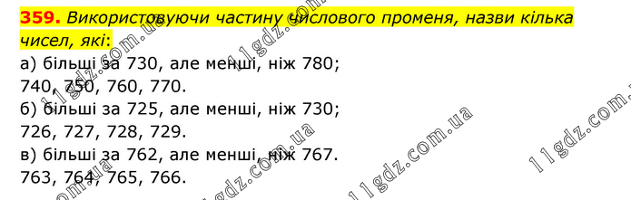 Використовуючи частину числового променя, назви кілька чисел, які: а) більші за 730, але менші, ніж 780; 740, 750, 760, 770. б) більші за 725, але менші, ніж 730; 726, 727, 728, 729. в) більші за 762, але менші, ніж 767. 763, 764, 765, 766.