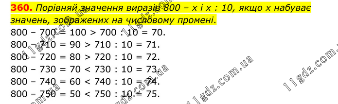 Порівняй значення виразів 800 – х і х : 10, якщо х набуває значень, зображених на числовому промені. 800 – 700 = 100 > 700 : 10 = 70. 800 – 710 = 90 > 710 : 10 = 71. 800 – 720 = 80 > 720 : 10 = 72. 800 – 730 = 70 < 730 : 10 = 73. 800 – 740 = 60 < 740 : 10 = 74. 800 – 750 = 50 < 750 : 10 = 75.