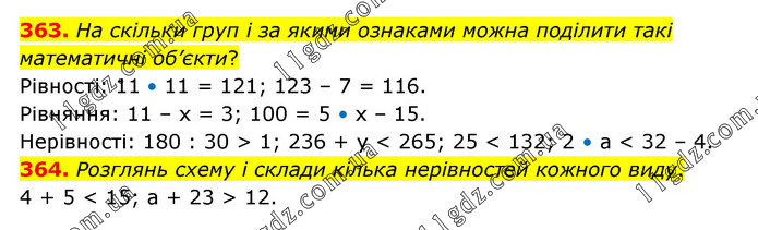 363. На скільки груп і за якими ознаками можна поділити такі математичні об’єкти? Рівності: 11 • 11 = 121; 123 – 7 = 116. Рівняння: 11 – х = 3; 100 = 5 • х – 15. Нерівності: 180 : 30 > 1; 236 + у < 265; 25 < 132; 2 • а < 32 – 4. 364. Розглянь схему і склади кілька нерівностей кожного виду. 4 + 5 < 15; a + 23 > 12.