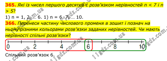 365. Які із чисел першого десятка є розв’язком нерівностей n < 7 і n > 5? 1) n = 1, 2, … 6. 1) n = 6, 7, … 10. 366. Перенеси частину числового променя в зошит і познач на ньому різними кольорами розв’язки заданих нерівностей. Чи мають нерівності спільні розв’язки? Спільний розв’язок 6.