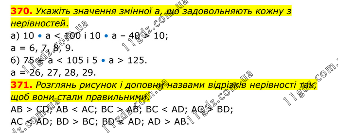 370. Укажіть значення змінної а, що задовольняють кожну з нерівностей. а) 10 • а < 100 і 10 • а – 40 > 10; а = 6, 7, 8, 9. б) 75 + а < 105 і 5 • а > 125. а = 26, 27, 28, 29. 371. Розглянь рисунок і доповни назвами відрізків нерівності так, щоб вони стали правильними. AB > CD; AB < AC; BC > AB; BC < AD; AC > BD; AC < AD; BD > BC; BD < AD; АD > AB.