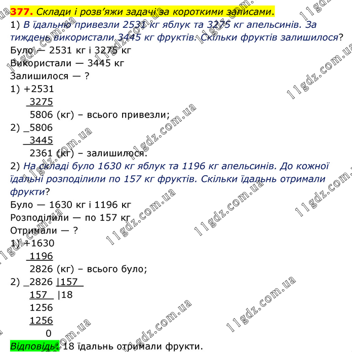 Склади і розв’яжи задачі за короткими записами. 1) В їдальню привезли 2531 кг яблук та 3275 кг апельсинів. За тиждень використали 3445 кг фруктів. Скільки фруктів залишилося? Було — 2531 кг і 3275 кг Використали — 3445 кг Залишилося — ? 2) На складі було 1630 кг яблук та 1196 кг апельсинів. До кожної їдальні розподілили по 157 кг фруктів. Скільки їдальнь отримали фрукти? Було — 1630 кг і 1196 кг Розподілили — по 157 кг Отримали — ?