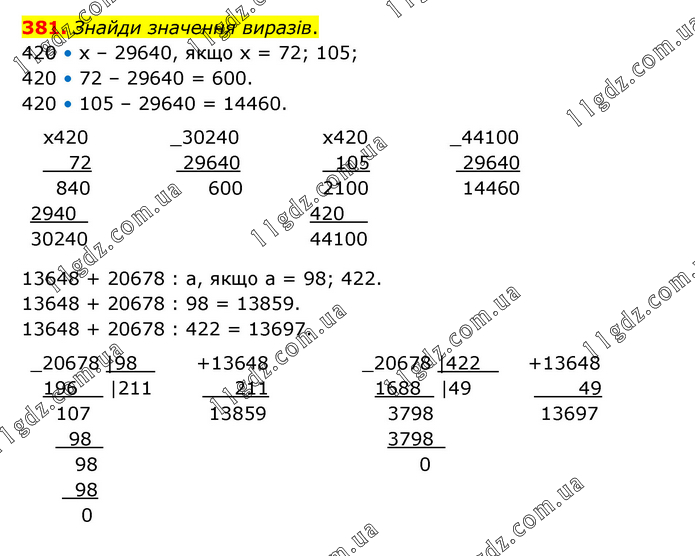 Знайди значення виразів. 420 • х – 29640, якщо х = 72; 105; 420 • 72 – 29640 = 600. 420 • 105 – 29640 = 14460. 13648 + 20678 : а, якщо а = 98; 422. 13648 + 20678 : 98 = 13859. 13648 + 20678 : 422 = 13697.