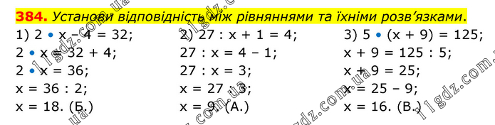 Установи відповідність між рівняннями та їхніми розв’язками. 1) 2 • х – 4 = 32; 2 • х = 32 + 4; 2 • х = 36; х = 36 : 2; х = 18. (Б.) 2) 27 : х + 1 = 4; 27 : х = 4 – 1; 27 : х = 3; х = 27 : 3; х = 9. (А.) 3) 5 • (х + 9) = 125; х + 9 = 125 : 5; х + 9 = 25; х = 25 – 9; х = 16. (В.)
