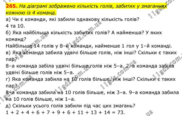 На діаграмі зображено кількість голів, забитих у змаганнях кожною із 4 команд. а) Чи є команди, які забили однакову кількість голів? 4 та 10. б) Яка найбільша кількість забитих голів? А найменша? У яких команд? Найбільша 14 голів у 8–й команди, найменше 1 гол у 1–й команді. в) Яка команда забила удвічі більше голів, ніж інші? Скільки є таких пар? 8–а команда забіла удвічі більше голів ніж 5–а. 2–а команда забіла удвічі більше голів ніж 5–а. г) Яка команда забила на 10 голів більше, ніж інші? Скільки є таких пар? 8–а команда забила на 10 голів більше, ніж 3–а. 9–а команда забила на 10 голів більше, ніж 1–а. д) Скільки усього голів забили під час цих змагань? 1 + 2 + 4 + 6 + 7 + 9 + 6 + 11 + 13 + 14 = 73.