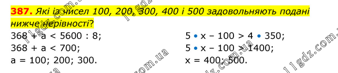 Які із чисел 100, 200, 300, 400 і 500 задовольняють подані нижче нерівності? 368 + а < 5600 : 8; 368 + а < 700; a = 100; 200; 300. 5 • х – 100 > 4 • 350; 5 • х – 100 > 1400; x = 400; 500.