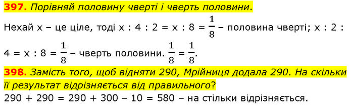 397. Порівняй половину чверті і чверть половини. Нехай х – це ціле, тоді х : 4 : 2 = х : 8 = 1/8 – половина чверті; х : 2 : 4 = х : 8 = 1/8 – чверть половини. 1/8 = 1/8. 398. Замість того, щоб відняти 290, Мрійниця додала 290. На скільки її результат відрізняється від правильного? 290 + 290 = 290 + 300 – 10 = 580 – на стільки відрізняється.