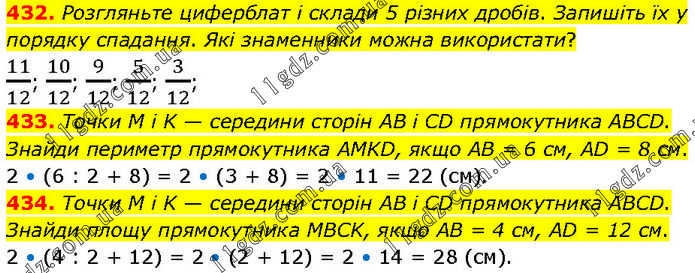 432. Розгляньте циферблат і склади 5 різних дробів. Запишіть їх у порядку спадання. Які знаменники можна використати? 11/12; 10/12; 9/12; 5/12; 3/12; 433. Точки М і K — середини сторін AB і CD прямокутника ABCD. Знайди периметр прямокутника AMKD, якщо AB = 6 см, AD = 8 см. 2 • (6 : 2 + 8) = 2 • (3 + 8) = 2 • 11 = 22 (см). 434. Точки M і K — середини сторін AB і CD прямокутника ABCD. Знайди площу прямокутника MBCK, якщо AB = 4 см, AD = 12 см. 2 • (4 : 2 + 12) = 2 • (2 + 12) = 2 • 14 = 28 (см).