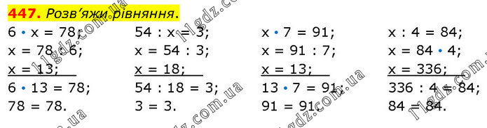 Розв’яжи рівняння. 6 • х = 78; х = 78 : 6; х = 13;__ 6 • 13 = 78; 78 = 78. 54 : х = 3; х = 54 : 3; х = 18;__ 54 : 18 = 3; 3 = 3. х • 7 = 91; х = 91 : 7; х = 13;__ 13 • 7 = 91; 91 = 91. х : 4 = 84; х = 84 • 4; х = 336;__ 336 : 4 = 84; 84 = 84.