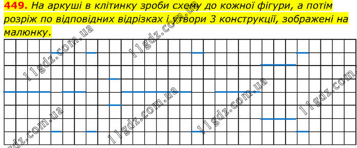 На аркуші в клітинку зроби схему до кожної фігури, а потім розріж по відповідних відрізках і утвори 3 конструкції, зображені на малюнку.