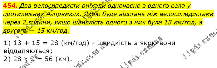 Два велосипедисти виїхали одночасно з одного села у протилежних напрямках. Якою буде відстань між велосипедистами через 2 години, якщо швидкість одного з них була 13 км/год, а другого — 15 км/год. 1) 13 + 15 = 28 (км/год) – швидкість з якою вони віддаляються; 2) 28 • 2 = 56 (км)