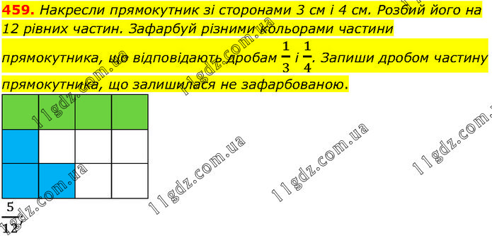 Накресли прямокутник зі сторонами 3 см і 4 см. Розбий його на 12 рівних частин. Зафарбуй різними кольорами частини прямокутника, що відповідають дробам 1/3 і 1/4. Запиши дробом частину прямокутника, що залишилася не зафарбованою. 5/12;