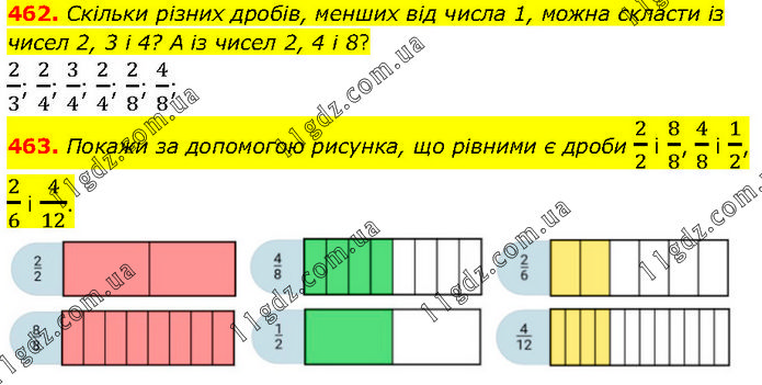 462. Скільки різних дробів, менших від числа 1, можна скласти із чисел 2, 3 і 4? А із чисел 2, 4 і 8? 2/3; 2/4; 3/4; 2/4; 2/8; 4/8; 463. Покажи за допомогою рисунка, що рівними є дроби 2/2 і 8/8, 4/8 і 1/2, 2/6 і 4/12.