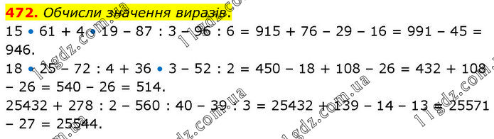 Обчисли значення виразів. 15 • 61 + 4 • 19 – 87 : 3 – 96 : 6 = 915 + 76 – 29 – 16 = 991 – 45 = 946. 18 • 25 – 72 : 4 + 36 • 3 – 52 : 2 = 450 – 18 + 108 – 26 = 432 + 108 – 26 = 540 – 26 = 514. 25432 + 278 : 2 – 560 : 40 – 39 : 3 = 25432 + 139 – 14 – 13 = 25571 – 27 = 25544.