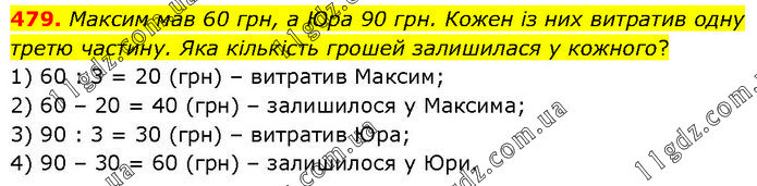 Максим мав 60 грн, а Юра 90 грн. Кожен із них витратив одну третю частину. Яка кількість грошей залишилася у кожного? 1) 60 : 3 = 20 (грн) – витратив Максим; 2) 60 – 20 = 40 (грн) – залишилося у Максима; 3) 90 : 3 = 30 (грн) – витратив Юра; 4) 90 – 30 = 60 (грн) – залишилося у Юри.