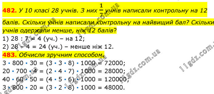 482. У 10 класі 28 учнів. З них 1/7 учнів написали контрольну на 12 балів. Скільки учнів написали контрольну на найвищий бал? Скільки учнів одержали менше, ніж 12 балів? 1) 28 : 7 = 4 (уч.) – на 12; 2) 28 – 4 = 24 (уч.) – менше ніж 12. 483. Обчисли зручним способом. 3 • 800 • 30 = (3 • 3 • 8) • 1000 = 72000; 20 • 700 • 4 = (2 • 4 • 7) • 1000 = 28000; 40 • 60 • 50 = (4 • 5 • 6) • 1000 = 120000; 3 • 800 • 20 = (3 • 2 • 8) • 1000 = 48000.