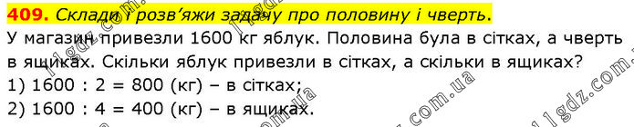 Склади і розв’яжи задачу про половину і чверть. У магазин привезли 1600 кг яблук. Половина була в сітках, а чверть в ящиках. Скільки яблук привезли в сітках, а скільки в ящиках? 1) 1600 : 2 = 800 (кг) – в сітках; 2) 1600 : 4 = 400 (кг) – в ящиках.