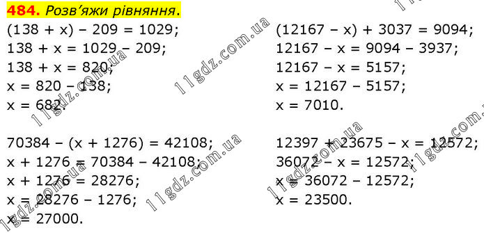 Розв’яжи рівняння. (138 + х) – 209 = 1029; 138 + х = 1029 – 209; 138 + х = 820; х = 820 – 138; х = 682. (12167 – х) + 3037 = 9094; 12167 – х = 9094 – 3937; 12167 – х = 5157; х = 12167 – 5157; х = 7010. 70384 – (х + 1276) = 42108; х + 1276 = 70384 – 42108; х + 1276 = 28276; х = 28276 – 1276; х = 27000. 12397 + 23675 – х = 12572; 36072 – х = 12572; х = 36072 – 12572; х = 23500.