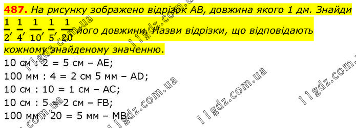 На рисунку зображено відрізок АВ, довжина якого 1 дм. Знайди 1/2, 1/4, 1/10, 1/5, 1/20 його довжини. Назви відрізки, що відповідають кожному знайденому значенню. 10 см : 2 = 5 см – AE; 100 мм : 4 = 2 см 5 мм – AD; 10 см : 10 = 1 см – АС; 10 см : 5 = 2 см – FB; 100 мм : 20 = 5 мм – МВ.