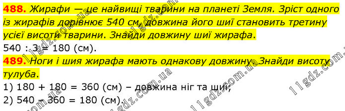 488. Жирафи — це найвищі тварини на планеті Земля. Зріст одного із жирафів дорівнює 540 см, довжина його шиї становить третину усієї висоти тварини. Знайди довжину шиї жирафа. 540 : 3 = 180 (см). 489. Ноги і шия жирафа мають однакову довжину. Знайди висоту тулуба. 1) 180 + 180 = 360 (см) – довжина ніг та шиї; 2) 540 – 360 = 180 (см).
