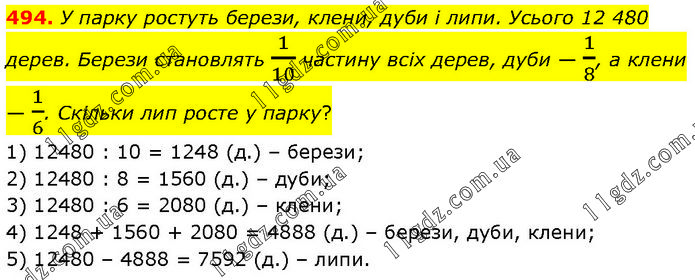 У парку ростуть берези, клени, дуби і липи. Усього 12 480 дерев. Берези становлять 1/10 частину всіх дерев, дуби — 1/8, а клени — 1/6. Скільки лип росте у парку? 1) 12480 : 10 = 1248 (д.) – берези; 2) 12480 : 8 = 1560 (д.) – дуби; 3) 12480 : 6 = 2080 (д.) – клени; 4) 1248 + 1560 + 2080 = 4888 (д.) – берези, дуби, клени; 5) 12480 – 4888 = 7592 (д.) – липи.