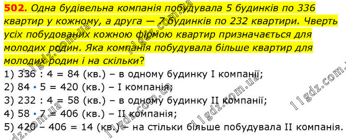 Одна будівельна компанія побудувала 5 будинків по 336 квартир у кожному, а друга — 7 будинків по 232 квартири. Чверть усіх побудованих кожною фірмою квартир призначається для молодих родин. Яка компанія побудувала більше квартир для молодих родин і на скільки? 1) 336 : 4 = 84 (кв.) – в одному будинку І компанії; 2) 84 • 5 = 420 (кв.) – І компанія; 3) 232 : 4 = 58 (кв.) – в одному будинку ІІ компанії; 4) 58 • 7 = 406 (кв.) – ІІ компанія; 5) 420 – 406 = 14 (кв.) – на стільки більше побудувала ІІ компанія.