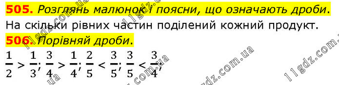 505. Розглянь малюнок і поясни, що означають дроби. На скільки рівних частин поділений кожний продукт. 506. Порівняй дроби. 1/2 > 1/3; 3/4 > 1/4; 2/5 < 3/5; 3/5 < 3/4;