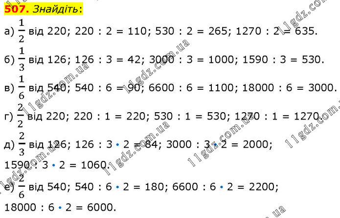 Знайдіть: а) 1/2 від 220; 220 : 2 = 110; 530 : 2 = 265; 1270 : 2 = 635. б) 1/3 від 126; 126 : 3 = 42; 3000 : 3 = 1000; 1590 : 3 = 530. в) 1/6 від 540; 540 : 6 = 90; 6600 : 6 = 1100; 18000 : 6 = 3000. г) 2/2 від 220; 220 : 1 = 220; 530 : 1 = 530; 1270 : 1 = 1270. д) 2/3 від 126; 126 : 3 • 2 = 84; 3000 : 3 • 2 = 2000; 1590 : 3 • 2 = 1060. е) 2/6 від 540; 540 : 6 • 2 = 180; 6600 : 6 • 2 = 2200; 18000 : 6 • 2 = 6000.
