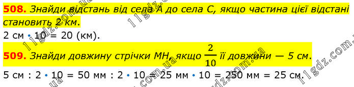 508. Знайди відстань від села А до села С, якщо частина цієї відстані становить 2 км. 2 см • 10 = 20 (км). 509. Знайди довжину стрічки МН, якщо 2/10 її довжини — 5 см. 5 см : 2 • 10 = 50 мм : 2 • 10 = 25 мм • 10 = 250 мм = 25 см.