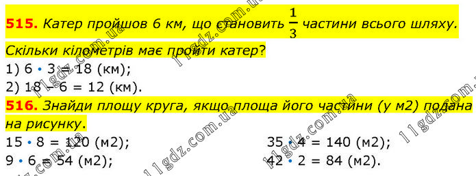 515. Катер пройшов 6 км, що становить 1/3 частини всього шляху. Скільки кілометрів має пройти катер? 1) 6 • 3 = 18 (км); 2) 18 – 6 = 12 (км). 516. Знайди площу круга, якщо площа його частини (у м2) подана на рисунку. 15 • 8 = 120 (м2); 9 • 6 = 54 (м2); 35 • 4 = 140 (м2); 42 • 2 = 84 (м2).